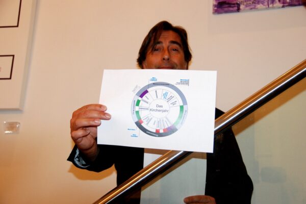 Interessant ist die Frage, ob die Telekom für einen „Magenta-Shop“ eine Marke anmelden kann. Normalerweise kann man für Herkunftsbezeichnungen keinen Schutz erlangen. In Norditalien gibt es eine Stadt die Magenta heißt. Also kann man für einen Magenta-Shop ebenso wenig einen Schutz erlangen, wie für einen Hamburger-Shop. Konzernsitz der Telekom ist außerdem Bonn und nicht Magenta in Norditalien. Gegenbeispiel : Komplementärfarbe zu Magenta ist ein gelblicher Grünton, wie bei einer Gurke. Für Spreewald-Gurken gibt es einen Schutz der Herkunftsbezeichnung, genauso wie für Lübecker Marzipan. Es bleibt also spannend, meine Damen und Herren. Früher galten ja Lilatöne eher als die Farben der Gestörten, reserviert z. B. für Bhagwan – Sannyasins, die schon morgens um 6 zur Meditation antreten und danach ohne Mindestlohn im Ashram malochen. Hier haben wir ihn nochmal, den guten OSHO mit klugem Spruch : (Indisch aussprechen) „In the Space of No-Mind, truth decends like Light“. Super meine Damen und Herren. Erst wenn wir das Gehirn abschalten erreicht uns das Licht der Wahrheit. Ich dachte immer man muss den Verstand anschalten um die Wahrheit zu erkennen. Heute sind Lila-Töne hochaktuell. Die Firma Pantone hat Lila zur Farbe des Jahres 2018 ausgerufen. Der Spiegel widmet sich der Sache mit einem Artikel, der mit „Ausgerechnet Lila“ überschrieben ist und tut ein Foto von Prince dazu. Prince, tot aber immer noch Sympathieträger, unstreitig ein Genie. Bevor er Stadienkonzerte machte, trat er vor Urzeiten in der Hamburger Sporthalle auf, da brannte einfach die Luft und ich war noch vital genug, meine Freundin auf den Schultern zu tragen, damit sie besser sehen konnte. Gibt ja auch Songs in denen Lila vorkommt. „Purple Rain“ von Prince. Oder gleich ganze Bandnamen siehe „Deep Purple“. Mein persönliches Erlebnis mit Lila war ein kommerzielles. Ich hatte vor etwa 10 Jahren mein Anwaltsbüro verkauft und mußte den Seidenhandel meiner verstorbenen Mutter übernehmen. Die Angestellten redeten nicht viel mit mir und so zog ich durch Deutschland mit unserer Seidenkollektion, mit 25 bis 30 Vorlageterminen die Woche. Da war alles dabei, von der mondänen Münchener Boutique, bis zur Sargaustattung, eine lustige Zeit. Immer wenn ich müde hinterm Lenkrad saß, dachte ich an den Spruch meiner Mutter „Umsatz heilt alle Wunden“. Schöne Umsätze machte ich mit Klöstern, die eine eigene Paramentenwerkstatt haben. Am Besten gingen immer die die Farben grün, wie bei der Spreewaldgurke und Lila, wie bei Prince, Osho und der Telekom. Hierzu müsst ihr wissen, dass diese Farben Bestandteile des sog. lithurgischen Kalenders sind. Hier der katholische Kalender :
