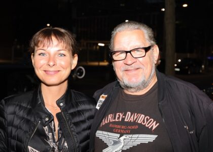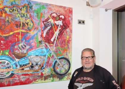 Das Gemälde zeigt mehr, als einen drehmomentstarken Soft-Chopper. Es gibt auch die Liedzeile: “It´s only Rock`N`Roll“, das Rolling Stones-Logo und eine Gitarre zu sehen. Bei der Gitarre handelt es sich, jedenfalls der Form nach, um das Modell „Stratocaster“ von Fender. Hier sehen wir Keith Richards von den Rolling Stones mit einer Stratocaster als Arbeitsgerät: Wer es noch realistischer liebt, für den haben wir heute mal eine Fender Stratocaster im Original mitgebracht. Betty, halte das Ding mal hoch! Du hast heute schwer zu tragen, das gebe ich zu. Die Fender Stratocaster kam ursprünglich 1954 auf den Markt und gilt als beliebteste, meistverkaufte und meistkopierte E-Gitarre weltweit. Wikipedia schreibt über die Bedeutung der Stratocaster in der Kunst: „Die Grundform der Stratocaster wird daher bis heute häufig als optischer Ausdruck des Rock ’n’ Roll verwendet und findet sich – mehr oder minder stilisiert – auf zahllosen Plattencovern, Werbeschildern, Konzertplakaten, Aufnähern, bei Dekoration von Diskotheken und Gaststätten bis hin zu Comics und Kinderspielzeug wieder.“ Ebenso, wie meine Motorräder stammt die Gitarre aus dem Fundus meiner Dinge, die ich immer schon mal bedienen wollte, wenn ich nur Zeit dafür hätte. Betty, jetzt kommt dein Satz: „Das ist ja so ein Männerding. Ihr habt das mehr damit. Frauen haben so was in der Art auch nicht.“ Vorläufig muss ich die Bedienung der Stratocaster also Keith Richards überlassen. Ich habe mal seine Biographie mit dem Titel „Live“ gelesen. Sein Lebensstil war hiernach von Allem anderen als Verzicht geprägt. Vor allem sein Umgang mit berauschenden Stoffen wurde bekannt. In einem Interview sagte er: „Das Merkwürdigste, was ich je versucht habe durch die Nase zu ziehen? Meinen Vater, ich habe meinen Vater gesnifft. Er war eingeäschert worden, und ich konnte nicht widerstehen, ihn mit ein bisschen Koks zu zermahlen.“ Hier schließt sich denn auch der Kreis mit Karl Lagerfeld. Es war Lagerfelds ausdrücklicher Wunsch, eingeäschert zu werden, weil er – Zitat: „Keine Maikäfer im Körper wollte“. Meine Damen und Herren, die Maikäfersaison ist nun schon länger vorbei. Ich darf daran erinnern, dass wir in bald 3 Monaten schon wieder Weihnachten haben. Eine Vernissage ist eine Verkaufsveranstaltung. Beschenken Sie sich und / oder Andere mit einem Werk von Andreas Görzen, auch wenn ihm der Verkauf eines seiner Gemälde immer eine kleine Träne ins Knopfloch fallen lässt. Andreas schreibt mir: „Ich trenne mich schwer von meinen Werken, da jedes einzelne ein Stück von mir ist. Aber leichter macht es mir zu sehen, dass andere Menschen sich an meinen Werken erfreuen und das jeden Tag aufs Neue.“ Ich sprach vorhin von dem Fundus der Dinge, die man immer schon mal bedienen wollte, wenn man nur Zeit dafür hätte. Ich spreche von Trainingsfahrrädern, sonstigen sperrigen Trainingsgeräten, Raclettegrills, aufblasbaren Schwimmbädern und sonstigem, was sperrig ist und auch noch ein schlechtes Gewissen machen könnte. Davon haben Sie doch schon genug. Deswegen folgen Sie doch bitte Ihrem plötzlich auftretenden Kaufimpuls, wenn Ihnen eines unserer Exponate zusagt. Sie machen damit keinen Fehler. An die Herren der Schöpfung: Wie wäre es mit Minnie Mouse Chanel für das Ankleidezimmer Ihrer Gattin?