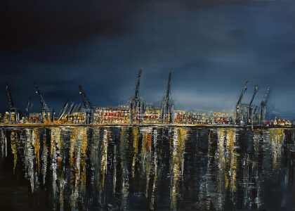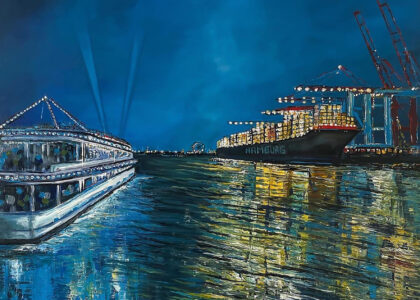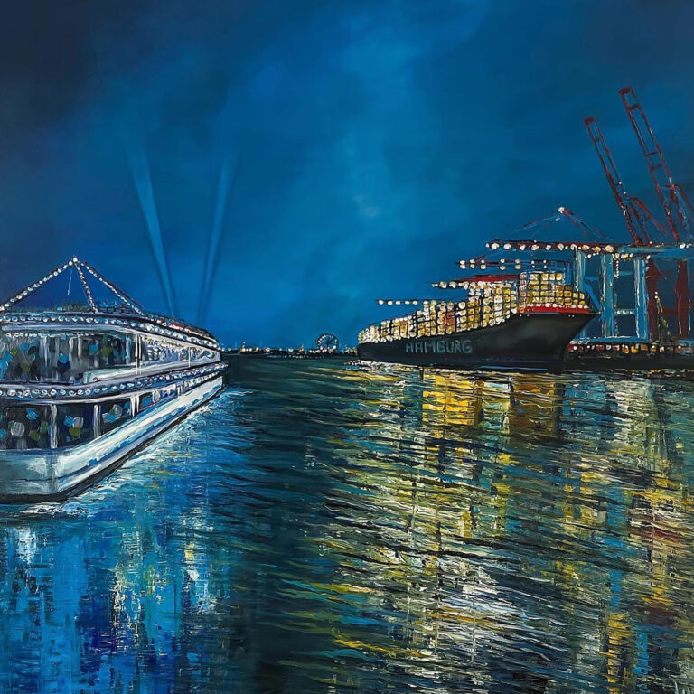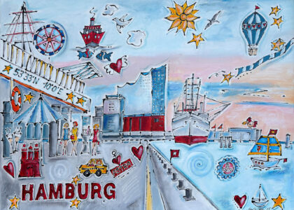 Seit vielen Jahren ist der Hamburger Hafen ihr Lieblingsort. Das Spiel von Wasser, Schiffen und den kraftvollen Wellen verwandelt sich in lebendige, farbenfrohe Kunstwerke. Hamburg – das Venedig des Nordens – und das ständige Fern weh sind die Quelle zahlreicher Spachteltechniken und Mischtechniken in Acryl. Doch auch die figurative Kunst liegt ihr am Herzen. Ihre Arbeiten schwanken zwischen realistischen, naiven Darstellungen, weichen Linien sowie aggressiven, energetischen Formen – und bieten so einen spannenden Kontrast zwischen figurativer, erotischer Kunst, Porträts und Abstraktem.