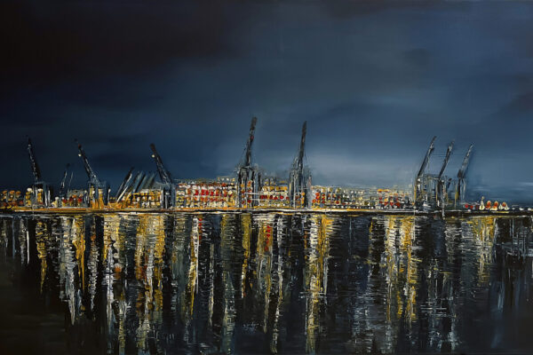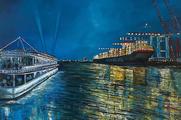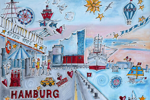 Seit vielen Jahren ist der Hamburger Hafen ihr Lieblingsort. Das Spiel von Wasser, Schiffen und den kraftvollen Wellen verwandelt sich in lebendige, farbenfrohe Kunstwerke. Hamburg – das Venedig des Nordens – und das ständige Fern weh sind die Quelle zahlreicher Spachteltechniken und Mischtechniken in Acryl. Doch auch die figurative Kunst liegt ihr am Herzen. Ihre Arbeiten schwanken zwischen realistischen, naiven Darstellungen, weichen Linien sowie aggressiven, energetischen Formen – und bieten so einen spannenden Kontrast zwischen figurativer, erotischer Kunst, Porträts und Abstraktem.