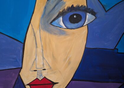 Gabriele Knospe hat ein solches expressionistisches Porträt eingebracht mit dem Titel „Hinter blauen Tüchern“: