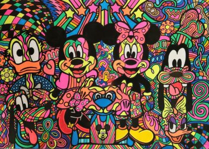 Die allermeisten Bildelemente sind ohne Weiteres zu identifizieren und gleich emotional bewertbar. Da haben wir Micky Maus, ein ambivalenter Typ. Er hatte ja ein Verhältnis mit Minnie Maus, aber ein wenig Ralf Schumacher steckt doch in ihm.