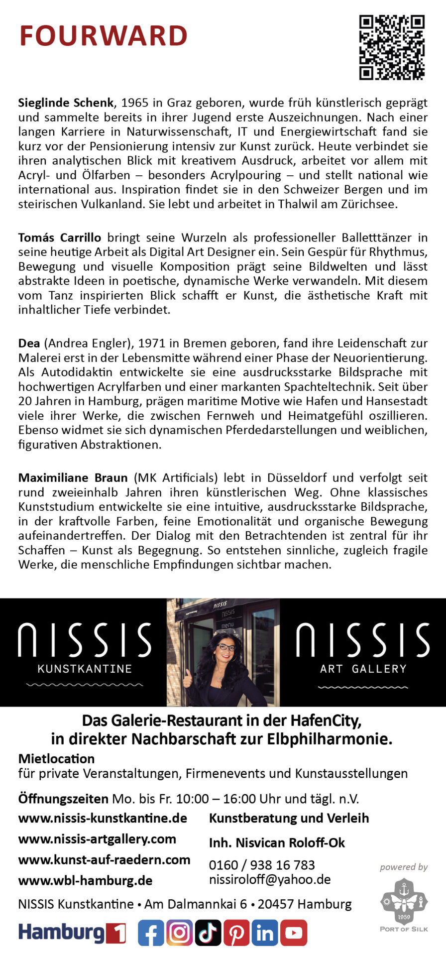 Ihre Werke sind ausdrucksstark und zugleich sinnlich, sie verbinden kraftvolle Kompositionen mit einer feinen, oft zerbrechlichen Emotionalität. Zwischen leuchtender Farbigkeit und reduzierter Schwarz-Weiß-Ästhetik entstehen Bilder, die Intensität und Stille miteinander vereinen.