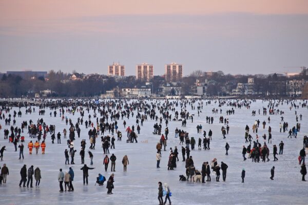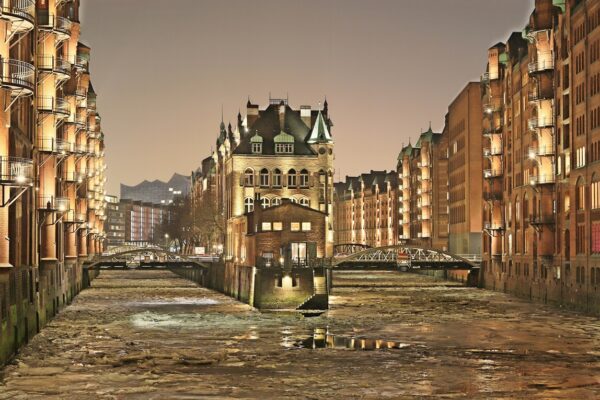 Die Perspektive geht über die Alster hin zu den 3 Hochhäusern in der Dorotheenstraße. In der Dorotheenstraße habe ich 10 Jahre lang gearbeitet, die 3 Kuben waren praktisch meine täglichen Begleiter. Obwohl in der 60ern gebaut, sind die Wohnungen heiß begehrt, weil – wie man sieht – in den oberen Etagen mit echtem Alsterblick. Gegenüber des Hochhauses ganz rechts befand sich eine Hinterhoftankstelle namens Tankstelle Schultz. Als Mann von Welt gab ich da morgens meinen Jaguar XJS Cabrio zum Betanken und zur Wagenpflege ab. Nach Dienstschluss holte ich ihn dann immer betankt und geputzt wieder ab. Irgendwann wurde der Jaguar – ich hatte ihn sträflicher Weise verliehen – Opfer einer koreanischen Kleinlimousine, die das Heck zum Totalschaden verformte. Nun aber zurück zum Foto „Außenalster“: Der Winter 2012, einer der seltenen Winter, in denen die Alster zugefroren war. Ein Spektakel! Wer dabei war, wird sich erinnern. Aber: Es gibt auch eine besondere Zutat in dem Foto, das es im besten Sinne artsy also künstlerisch macht. In der Ecke links unten sind 3 Personen in oranger Montur zu sehen, gewissermaßen als Entsprechung für die 3 Hochhäuser im Hintergrund. Dafür braucht es ein schlaues Auge. Orange trägt nur die Müllabfuhr. Hier wird es sich aber sicherlich um Rettungspersonal handeln. Alstereisvergnügen ohne Schnapsleichen und Knochenbrüche, das ist ja schlicht undenkbar. Also ein Foto, das einerseits Assoziationen auslöst, andererseits aber auch diese gewisse Zutat hat, dass es zu einem Kunstwerk macht. Im Hinblick auf spontan auftretende Kaufimpulse darf ich daran erinnern, dass in eins, zwei, drei, vier Monaten schon wieder Weihnachten ist. Kaum hat man sich die Schweißtropfen von der klimaverrückten Birne abgetupft, muss man schon wieder auf die Jagd nach Weihnachtsgeschenken gehen. Wer weiß, ob man dann noch mit dem Auto in die Stadt fahren darf? Zwei Straßen beim Rathaus sind schon für autofrei erklärt worden und Ottensen schottet ebenfalls ab. 2500 Haushalte und 200 Gewerbebetriebe sind mit dem Auto nicht mehr zu erreichen. Taxifahren ist auch verboten. Eine Stadt, die sich entmobilisiert. Wir werden wieder zu Jägern und Sammlern, die sich zu Fuß durchschlagen müssen. Deswegen sammeln Sie bitte jetzt schon die Geschenke ein, die Sie bald brauchen. Eine Idee wäre zum Beispiel Foto „Wasserschloss Winter“: