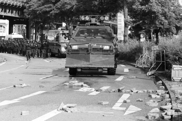 Eine herrliche Winterszene. Die Speicherstadt gülden erleuchtet. Im Kanal schwimmen die Eisschollen. Atmosphärisch ein tolles Weihnachtsgeschenk. Was will man denn mit einer Strandszene am Heiligabend? So was führt doch nur zu Diskussionen: „Die Frau da, die mit der pinken Luftmatratze, das könnte ich sein!“, sagt die Gattin, „wenn du rechtzeitig gebucht hättest. Dann müssten wir hier nicht bei 9° und Regenwetter sitzen und morgen zu Oma fahren!“ Auch der Nachwuchs, hier halbrechts im Bild, hat auf einmal Fernweh nach dem Ballermann. Also, meine Damen und Herren, denken Sie jetzt schon an Weihnachten und kaufen Sie eine Winterszene aus der Speicherstadt. Saisontypisch und vom Motiv her „very hanseatic“. Kommen Sie vor mit dem Kontor, kann man nur sagen. Auch für den Freund des Nutzfahrzeugs gibt es etwas in der Ausstellung. Ich beziehe mich auf dieses Foto mit dem Titel „G20 Gipfel in Hamburg“: