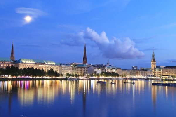 Vielleicht die moderne Stadtansicht von Hamburg überhaupt. Kein Mensch hätte Hamburg aus dieser Perspektive fotografiert, wenn dort nicht die Elbphilharmonie stehen würde. Wir erinnern uns, bevor es die Elbphilharmonie gab, stand dort nur der Kaiserspeicher. Betty, halt mal das Foto vom Kaiserspeicher hoch: Ein absolut hässlicher Klotz. Eine Architektursprache des Brutalismus, entkleidet von jeglichem Perlenglanz. Dazu auch noch absolut nutzlos, weil für Stückgut und nicht für Container gebaut. Jetzt haben wir es besser. Betty, halt noch mal Jerzys Foto hoch! Jerzy schreibt mir zu dem Foto: „Zwei Stunden vor Beginn der Eröffnung der Elphi hab ich mir bereits einen Platz gesucht, der ideal zum Schießen von Fotos ist. Solche Nachtbilder sind nur mit Stativ und viel Geduld möglich, denn es bedarf einer Belichtungszeit von mindestens 20 Sekunden pro Bild.“ Solche Geduld muss belohnt werden, meine Damen und Herren. In diesem Kontext darf ich daran erinnern, dass eine Vernissage nicht zuletzt eine Verkaufsveranstaltung ist. Kaufen Sie sich den neuen Perlenglanz von Hamburg zu Preis von 350 Euro im Format 70 x 100. Sie machen damit keinen Fehler. Handwerklich perfekt, moderne Perspektive, spektakuläre Momentaufnahme und Sie haben etwas zu erzählen, wenn Besuch kommt. Ein Nachtfoto von der Elphi am Eröffnungstag. Wunderbar, um im Gespräch zu bleiben und in jedem Fall unverfänglicher, als ein Akt- oder Nacktfoto jetzt in den Zeiten der politischen Korrektheit, in denen „Hamburg, meine Perle“ nicht mehr im Stadion gesungen werden soll. Wer es ganz klassisch mag, interessiert sich vielleicht perlenglanzmäßig für Foto „Binnenalster“: