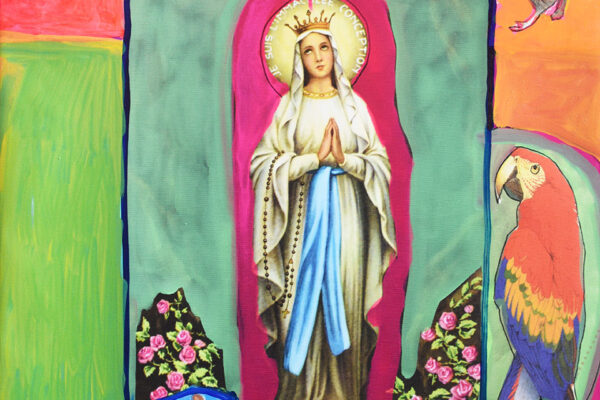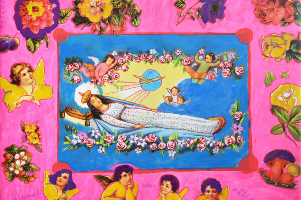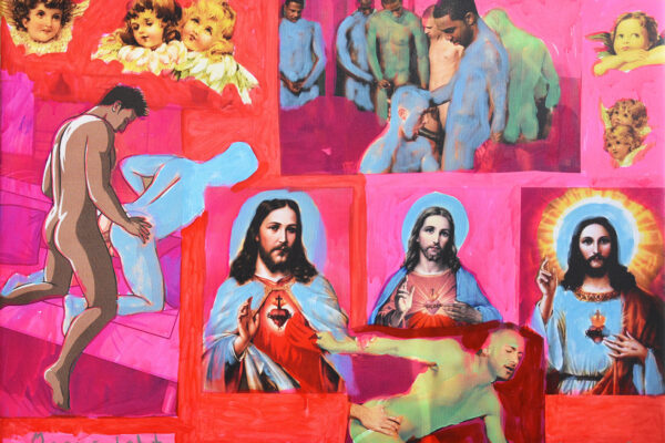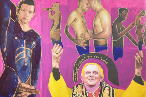 Heiligenbilder und homosexueller Anal- und Oralverkehr auf einer Leinwand, die unbefleckte Empfängnis durch Bildtitel verhöhnt „Mit wem hat sie gevögelt?“. Die einzige Frau, die Rosa von Praunheim zum Motiv seiner Bilder macht, ist Maria, voll der Gnade, der Herr ist mit dir. Ansonsten sind nur Herren zu sehen, die sich bis auf Papst Benedikt und Jesus miteinander vergnügen.