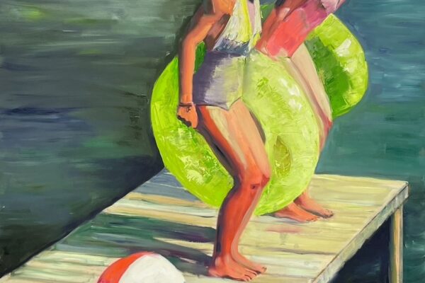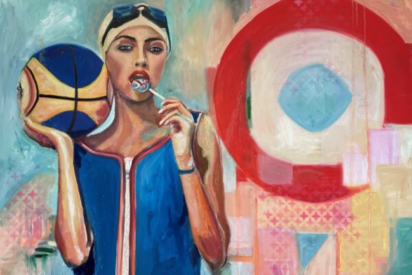 Liebe Freundinnen und Freunde der Kunstkantine, liebe Gäste, liebe Kunstschaffende! Willkommen im Bernsteinzimmer der HafenCity. Sie befinden sich in der 73. Vernissage der Kunstkantine seit ihrer Eröffnung im März 2013. Damit sind Sie jetzt nach Ort und Zeit orientiert. Mein Name ist Roloff, Bernd Roloff. Ich bin der Keynote-Speaker der Kunstkantine und darf Sie herzlich zu diesem besonderen Event begrüßen. Zu meiner Rechten meine Assistentin Betty, die ihren zweiten Vornamen nicht mag. Ich nenne sie einfach Moneypenny. Die Ausstellung hat das Motto „Kunst und gut“. Also, das Motto imponiert in seiner enormen Schlichtheit. So eine Art „Stammessen“. „Herr Kellner, 2 x Stamm“, was immer da auch kommt. Nun wollen wir mal mit dieser Laudatio etwas nachwürzen. Dazu bin ich ja da. Maribel hat die Ausstellung mit 4 sogenannten „Bathing Beauties“, also Strandschönheiten, bestückt, die allesamt eine Badekappe tragen. Bis Ende der 80er Jahre war es in fast allen öffentlichen Badeanstalten Pflicht, eine Badekappe zu tragen, da die beim Schwimmen ausfallenden Haare in den technischen Installationen der Schwimmbäder leicht zu Verstopfungen führen konnten. Ich bin ja in Quickborn aufgewachsen. Wir hatten ein Freibad: Der Bademeister hatte seinen Hochsitz zwischen der Wasserrutsche und dem Sprungturm platziert. Wenn an diesen beiden Hotspots des Quatschmachens nix zu tun war, wurde die korrekte Badekappennutzung beobachtet. Typischer Fall: 12 – 14jähriger Junge mit längeren Haaren, bei dem die Kopfbedeckung nur bis zur Ohrlinie reichte, quasi als Schmuck der Vokuhila-Frisur. Da kassierte man dann einen Pfiff aus der Trillerpfeife und man mühte sich darum, die Badekappe tieferzulegen. Badekappen haben etwas Nostalgisches. Moderne Schwimmbadszenen ab 1989 ersparen sich dieses einstmals stilbildende Accessoire. Hier etwa ein Werk von Terry Rodgers aus dem Jahr 1990: Offenbar ein Nudisten-Club. Hier ist gar nichts bedeckt. Luftmatratzen, Wasserbälle, Outdoor-Möbel, fröhliche Wasserspiele, aber von einer Badekappe ist nichts zu sehen oder zu bemerken. Wieder ein Dissertationsthema: „Die Badekappe in der Kunst“ Großartig. Maribel arbeitet in Serien: „Summer Game“, „Sunny“, „Summer Dreaming“ und schließlich „Summertime“: