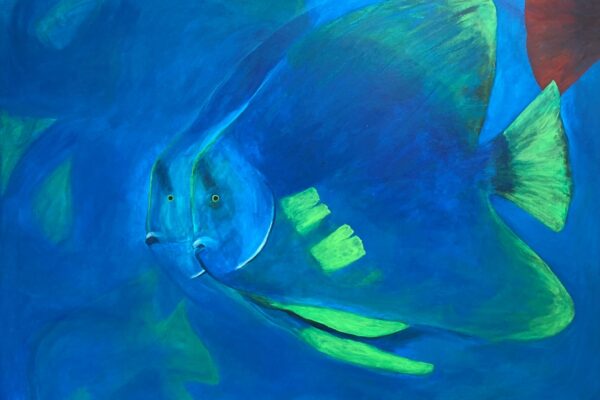 Kommen wir also von der Oberwasserwelt der Sommer-Serie von Maribel nun zur Unterwasserwelt. Die bei Gerd abgebildeten Fische sind zweifellos sogenannte Doktorfische. Der Doktorfisch erlangte weltweite mediale Aufmerksamkeit durch den Film „Findet Nemo“. Hier sehen wir Nemo mit seiner Kollegin Dori, der vergesslichen Palettendoktorfisch-Dame: Gerd hat sein Werk „Nähe“ genannt. Doktorfische, die sich aneinander kuscheln. Aus der Anbahnungsphase wird die Eroberungsphase und wenn die Beiden der Natur ihren freien Lauf lassen, geht es wie folgt weiter: „Der eigentliche Laichakt beginnt in der Regel mit einem Imponiergehabe, bei dem Rücken- und Afterflossen aufgestellt werden. Männchen und Weibchen schwimmen dabei parallel, wie bei Gerd. Wie bei vielen Fischarten üblich, die im freien Wasser ablaichen, schwimmen auch die Doktorfische für den eigentlichen Laichakt je nach Art zwei bis drei Meter aufwärts und stoßen auf dem höchsten Punkt gleichzeitig Eier und Sperma ab. Gelegentlich durchstoßen sie dabei sogar die Wasseroberfläche.“ So steht es bei Wikipedia. Das Werk „Nähe“ scheint mir also das richtige fürs Schlafzimmer zu sein, angemessene Deckenhöhe vorausgesetzt. Die Farbwirkung von Blau wird im Übrigen gemeinhin wie folgt beschrieben: Blau steht für Entspannung, Ruhe, Gelassenheit, Treue, Freiheit, Tiefe und Sehnsucht. Berühmte blaue Serienwerke sind beispielsweise die blaue Serie von Picasso ab 1901 oder Yves Klein mit seiner Ausstellung „Monochrome Bleu“ ab 1959, die ich selbst sogar einmal im Centre Pompidou in Paris gesehen habe, die ich allerdings in ihrer farbintensiven Schlichtheit eher beunruhigend fand. In die Kategorie „Beunruhigung“ fallen in dieser Ausstellung Werke wie zum Beispiel „Gender“ von Gerd: