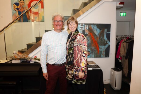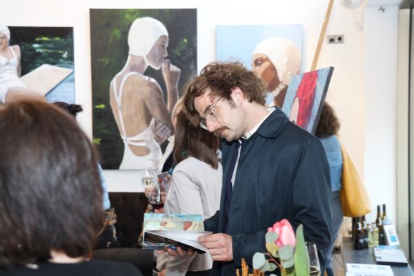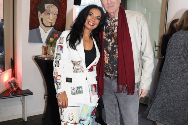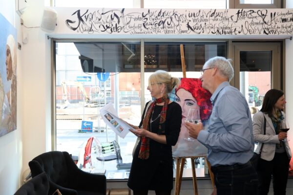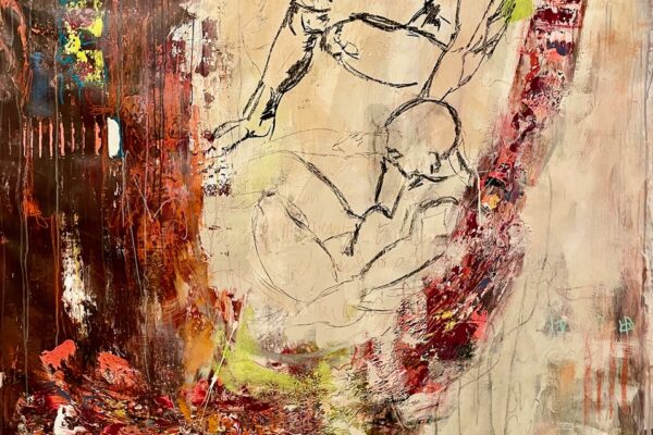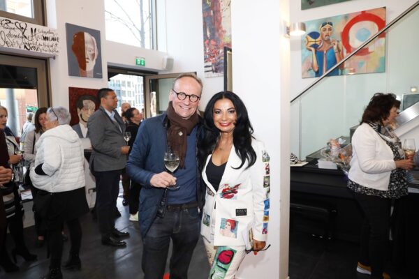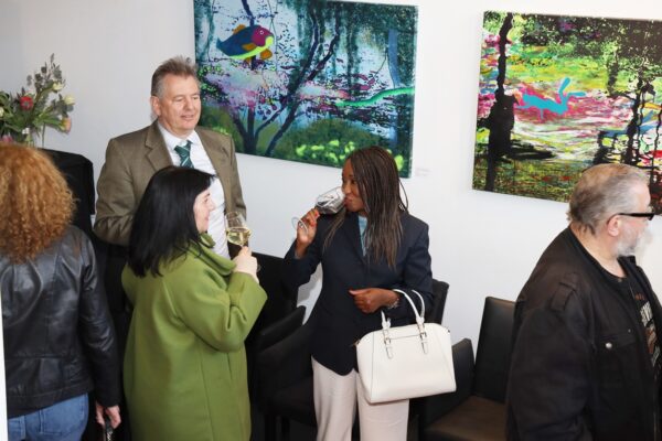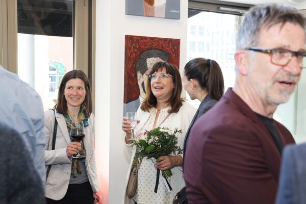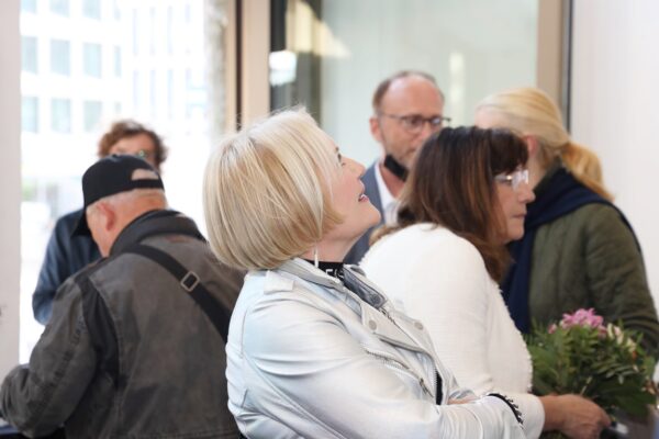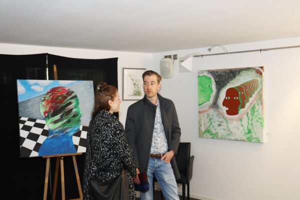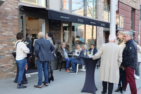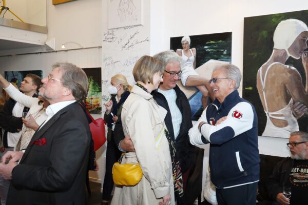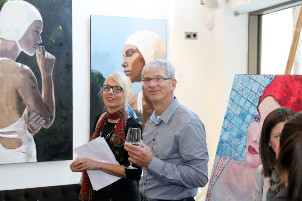 Eines der Lieblingsgemälde von Maribel ist übrigens „Strandspaziergang“ von Joaquin Sorolla aus dem Jahr 1909. Während die beiden Damen in hochgeschlossenen Kleidern ein züchtiges Defilée am Strand abschreiten, gibt es bei Maribel wenigstens etwas Haut und Aktion zu sehen. Habe ich vorhin gesagt, dass Badekappen etwas Nostalgisches haben? Ich habe von Maribels Antworten auf unserem Künstlerfragebogen ein Wort gelernt. Es heißt: Wichtigkeitsverlängerung. Insofern ist die Badekappendarstellung wohl eher eine Wichtigkeitsverlängerung als Nostalgie. Wie Sie wissen, ist eine Vernissage nicht zuletzt auch eine Verkaufsveranstaltung. Wir stellen uns mal vor, dass man bei 6,5° Außentemperatur, verhangenem Himmel und Nieselregen aus dem Schlafzimmer ins Wohnzimmer schlurft, so gegen 6:55 Uhr, also so wie meistens in den letzten 5, 6 Monaten und wir erblicken an der Wand ein Motiv aus der Sommerserie von Maribel. Zynischer Stimmung ist man nämlich erst ab einer gewissen Reifung des Tages. Also werden diese Werke früh am Morgen erfrischend motivierend abstrahlen. Eine Hoffnung auf einen schönen Sommer mit Schwimmring und Wasserball. Eben habe ich von Reifung gesprochen. In unserem „Fragebogen an den Künstler“ gibt es die Frage, was der Künstler bei der Werkschaffung am Schönsten findet, das fertige Bild oder den Flow beim Malen. Maribel gibt eine ganz neue Antwort: „Weder noch. Die Bilder brauchen eine Zeit zum Reifen. Manchmal sind die in einem Guss fertig, andere brauchen eine längere Zeit. Ich hänge die Bilder bei mir im Atelier auf und beobachte sie. Manchmal werden sie 1, 2, 3 Mal überarbeitet. Erst, wenn sie das richtige Bouquet entfalten können, werden sie signiert und reif für eine Ausstellung.“ Gerd gibt dagegen eine bodenständige Antwort auf die Frage, was für ihn wichtig ist: „Eher zielorientiert. Die Fertigstellung eines Bildes erfüllt mich Befriedigung“. Bildtitel finden beide Künstler wichtig, wobei Maribel nach meinem Eindruck eher Titel verwendet, die ihre momentane Stimmungslage ausdrücken, während Gerd eher auf die Stimmungslage oder die Message reflektiert, die das Werk ausdrückt. In diesen Kontext passt das Werk „Nähe“ von Gerd: