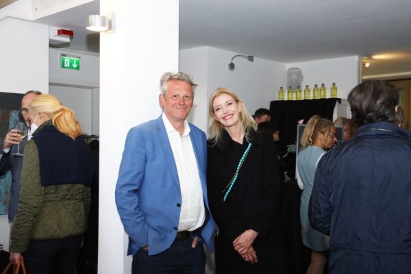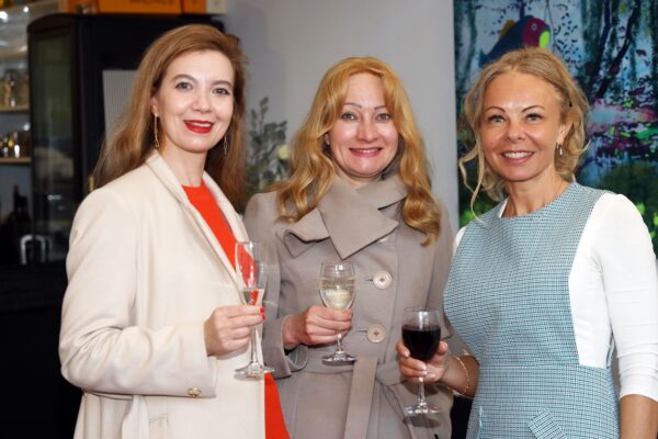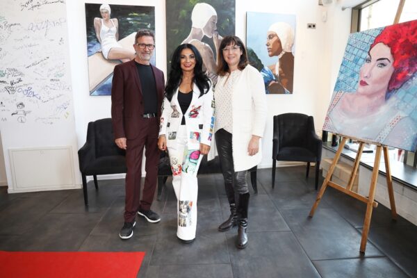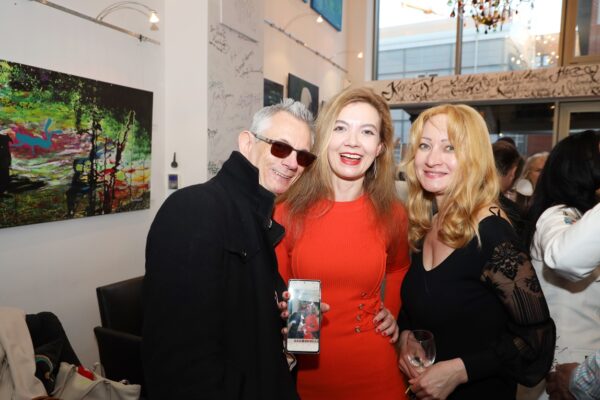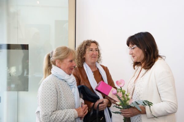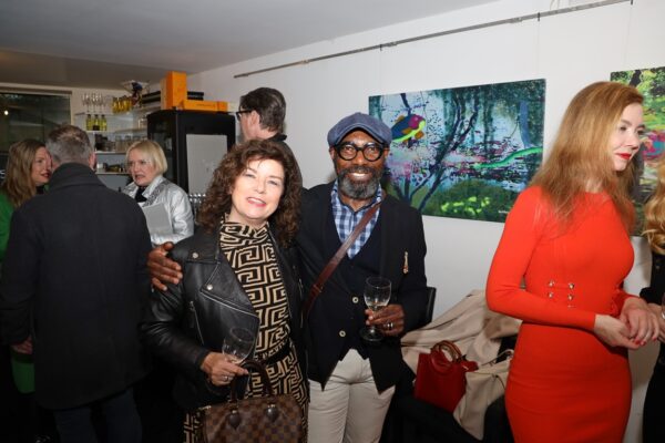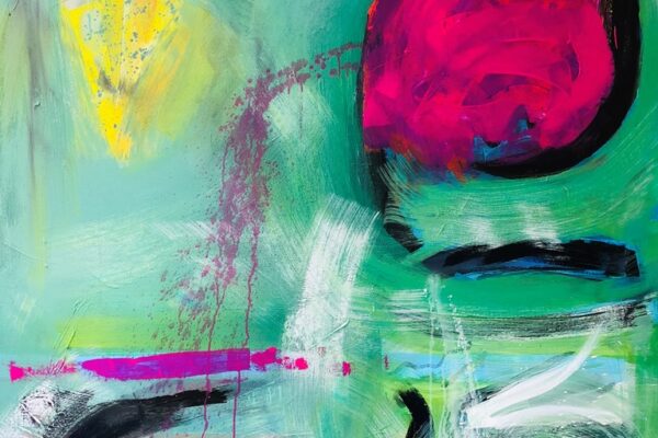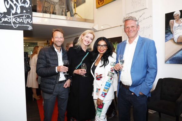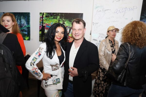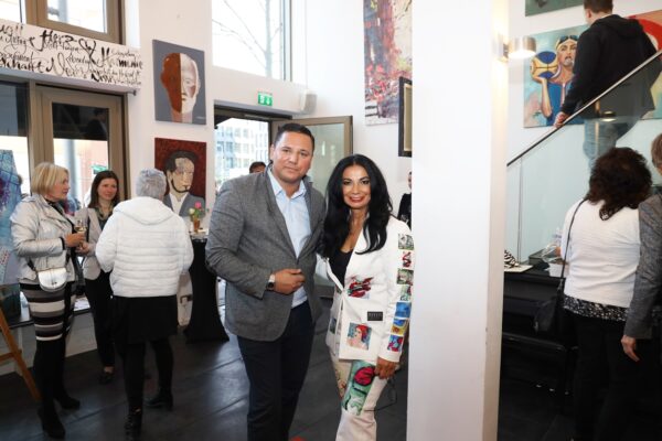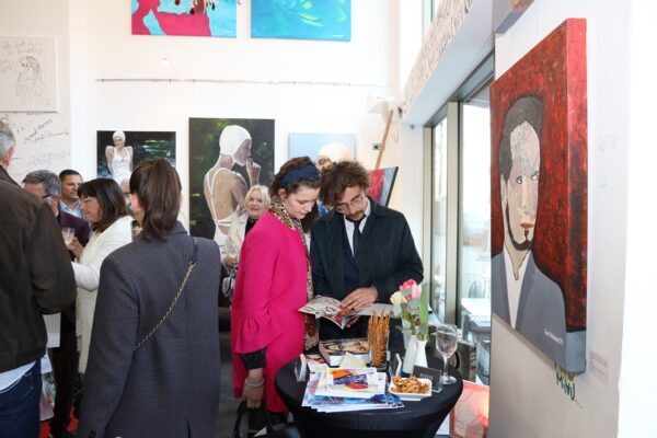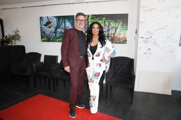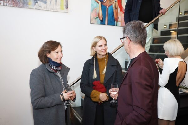 Eines der Lieblingsgemälde von Maribel ist übrigens „Strandspaziergang“ von Joaquin Sorolla aus dem Jahr 1909. Während die beiden Damen in hochgeschlossenen Kleidern ein züchtiges Defilée am Strand abschreiten, gibt es bei Maribel wenigstens etwas Haut und Aktion zu sehen. Habe ich vorhin gesagt, dass Badekappen etwas Nostalgisches haben? Ich habe von Maribels Antworten auf unserem Künstlerfragebogen ein Wort gelernt. Es heißt: Wichtigkeitsverlängerung. Insofern ist die Badekappendarstellung wohl eher eine Wichtigkeitsverlängerung als Nostalgie. Wie Sie wissen, ist eine Vernissage nicht zuletzt auch eine Verkaufsveranstaltung. Wir stellen uns mal vor, dass man bei 6,5° Außentemperatur, verhangenem Himmel und Nieselregen aus dem Schlafzimmer ins Wohnzimmer schlurft, so gegen 6:55 Uhr, also so wie meistens in den letzten 5, 6 Monaten und wir erblicken an der Wand ein Motiv aus der Sommerserie von Maribel. Zynischer Stimmung ist man nämlich erst ab einer gewissen Reifung des Tages. Also werden diese Werke früh am Morgen erfrischend motivierend abstrahlen. Eine Hoffnung auf einen schönen Sommer mit Schwimmring und Wasserball. Eben habe ich von Reifung gesprochen. In unserem „Fragebogen an den Künstler“ gibt es die Frage, was der Künstler bei der Werkschaffung am Schönsten findet, das fertige Bild oder den Flow beim Malen. Maribel gibt eine ganz neue Antwort: „Weder noch. Die Bilder brauchen eine Zeit zum Reifen. Manchmal sind die in einem Guss fertig, andere brauchen eine längere Zeit. Ich hänge die Bilder bei mir im Atelier auf und beobachte sie. Manchmal werden sie 1, 2, 3 Mal überarbeitet. Erst, wenn sie das richtige Bouquet entfalten können, werden sie signiert und reif für eine Ausstellung.“ Gerd gibt dagegen eine bodenständige Antwort auf die Frage, was für ihn wichtig ist: „Eher zielorientiert. Die Fertigstellung eines Bildes erfüllt mich Befriedigung“. Bildtitel finden beide Künstler wichtig, wobei Maribel nach meinem Eindruck eher Titel verwendet, die ihre momentane Stimmungslage ausdrücken, während Gerd eher auf die Stimmungslage oder die Message reflektiert, die das Werk ausdrückt. In diesen Kontext passt das Werk „Nähe“ von Gerd: