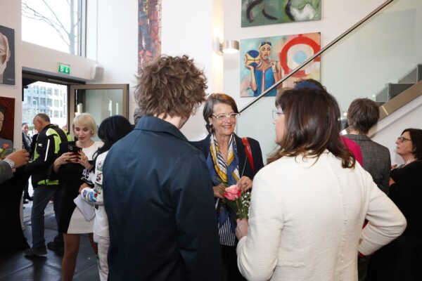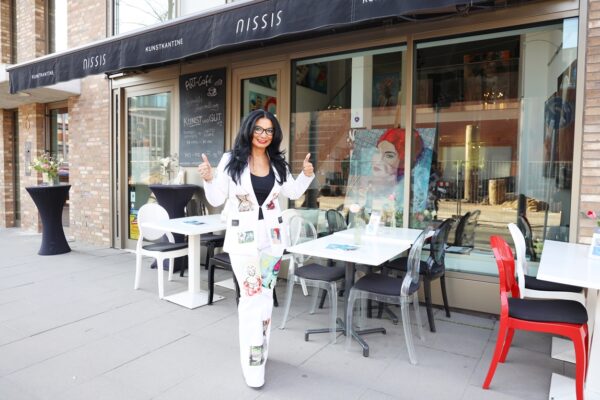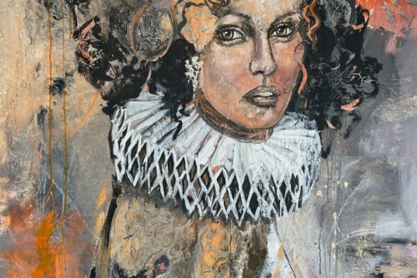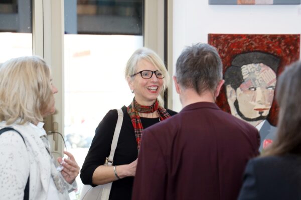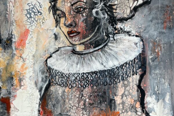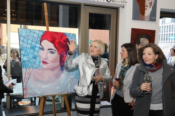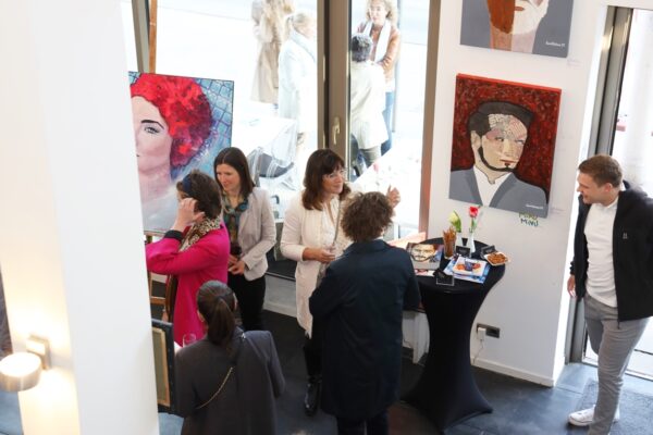 Es heißt: „Rokoko, gesegnete Frauenquote 3“ Meine Damen und Herren, für dieses Gemälde gilt das Motto von Frances Bacon: „The job of the artist is always to deepen the mystery”. Die erste Schwierigkeit liegt darin, dass sich das Gemälde, wie soll ich sagen – nur mühselig in die Kategorien der Porträts einordnen lässt. Vom Ausschnitt her ist es für ein Bruststück zu lang, und mit der Einordnung als Schulterstück gibt es auch Schwierigkeiten. Es fehlen die Schultern. Verständlich ist der Titel insoweit, als er sich auf das Rokoko bezieht. Wie wir wissen, war das Rokoko eine Stilrichtung der europäischen Kunst von etwa 1730 bis etwa 1780. Aber was fangen wir mit „gesegnete Frauenquote 3“ an? Wenn man das Werk lange genug ansieht, dann meint man, sich an den sehr alten 20-Mark-Schein zu erinnern: Diese Haube hat es irgendwie in sich. Die Frau auf dem 20-Mark-Schein war Elsbeth Tucher. Bekannt wurde sie durch ihre Abbildung auf einem Gemälde Albrecht Dürers, das sich in der Gemäldegalerie Alte Meister in Kassel befindet. Das Gemälde, datiert von 1499, ist also ca. 250 Jahre früher als das Rokoko entstanden. Da gab es noch keine Halskrause wie auf Maribels Gemälde „Rokoko, gesegnete Frauenquote 3“. Die Halskrause kommt erst Ende des 17. Jahrhunderts in Spiel als sogenannter Spanischer Kragen. Dementsprechend könnte der etwas neuere 20-Mark-Schein Vorlage für „Rokoko, gesegnete Frauenquote 3“ gewesen sein. „Rokoko, gesegnete Frauenquote 3“. Was macht man bloß mit der Frauenquote? Ja, meine Damen und Herren, hier ist Einiges an Assoziationskraft erforderlich. Dafür bin ich ja da. Die Frauenquote auf Geldscheinen war ursprünglich sehr bedenklich: Von den 7 amtlichen Geldscheinen wurden nur 2 mit den Porträts von Damen bedruckt. Beide auch noch auf den Scheinen mit dem eher geringerem Wert, 5 Mark und 20 Mark. In die Prestige-Regionen von 50 bis 1000 Mark drang die Weiblichkeit nicht vor. In der neuen D-Mark-Serie waren schon 4 von 8 Scheinen mit Frauenporträts bedruckt: Sogar den 500er-Schein zierte ein Frauenporträt, das der Maria Sibylla Merian: Wer zum Teufel war das denn nun? Frau Merian zeichnete sich insbesondere durch die Erforschung der Insektenfauna Surinams aus. Wenn man genau hinsieht, ist über der Zahl 500 offenbar als Anspielung eine blutsaugende Schnake zu erkennen. Verwirklichte man bei den alten D-Mark-Scheinen noch eine ansteigende Frauenquote, plagte die europäische Geldschein-Design-Abteilung offenbar die Gender-Diskussion. Laut Facebook gibt es 60 verschiedene Geschlechter. Deswegen sind auf den Euro-Scheinen wohl nur Gebäude zu sehen. Mal sehen, wie Alles so werden wird, im Moment ist ja galoppierende Inflation. Vielleicht kehren ja Porträts nach einer Währungsreform als bildwürdig auf Geldscheinen zurück. Apropos Inflation: Die Zeiten, in denen man sich reichsparen konnte, sind wohl erstmal vorbei. Die Zinsen sind weit niedriger als die Inflation. Entscheiden Sie sich möglichst noch heute, jedenfalls bald, für ein Werk aus dieser Ausstellung. Geld auszugeben ist in diesen Zeiten ein Segen, es wird immer weniger wert. Geben Sie es aus für ein Gemälde, das sie inspiriert, zu dem Sie Assoziationen haben und das vielleicht auch Diskussionen erzeugt, wenn Sie Gäste haben. Hier ist die Gelegenheit, nutzen Sie sie! Meine Damen und Herren, ich danke für Ihre Aufmerksamkeit und wünsche Ihnen für diesen Abend viel Vergnügen. Bis bald in diesem Theater. Bernd Roloff Aus Datenschutzgründen sind einige Bilder nicht veröffentlicht. Die Setzerin
