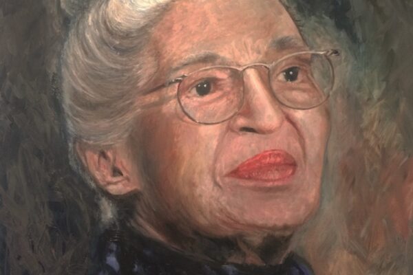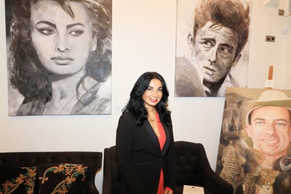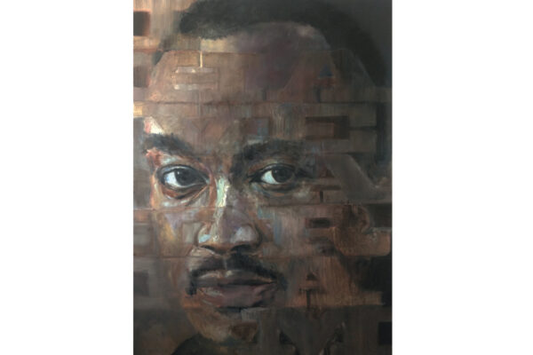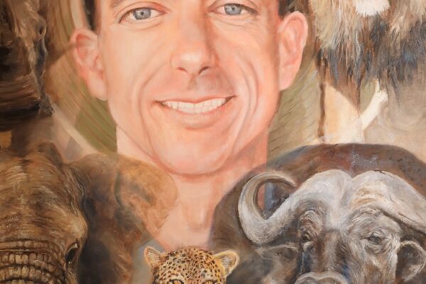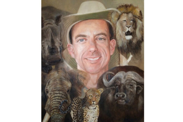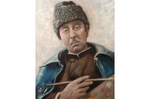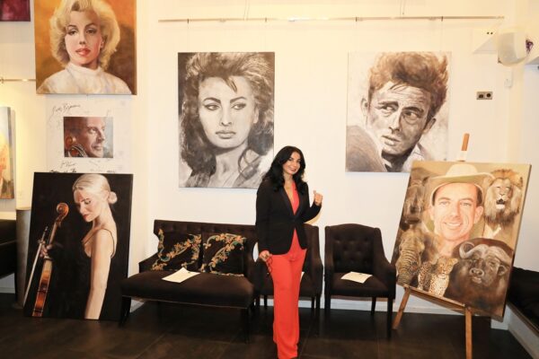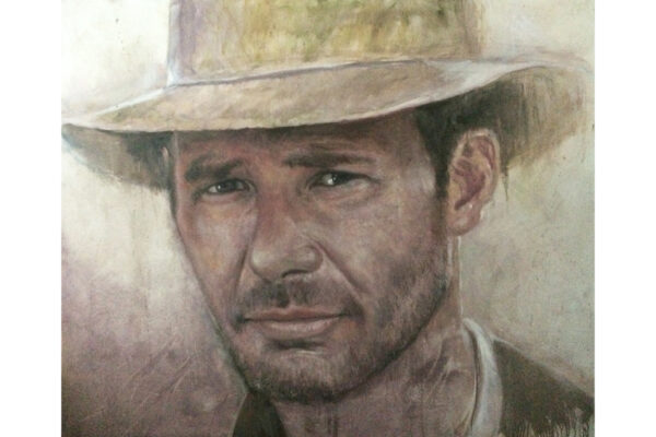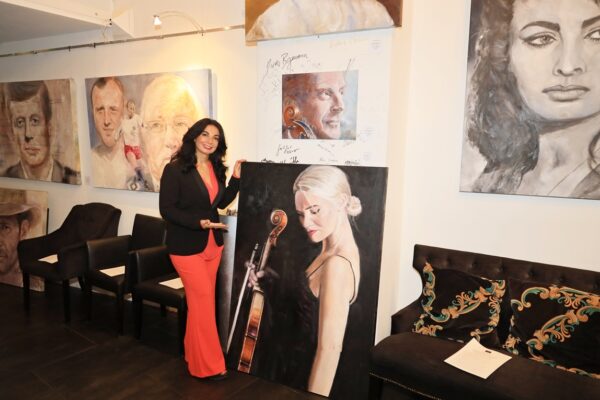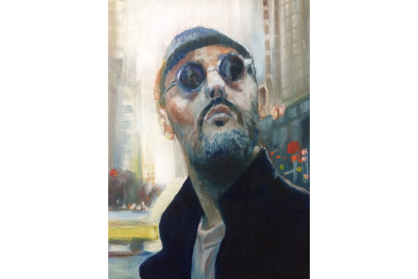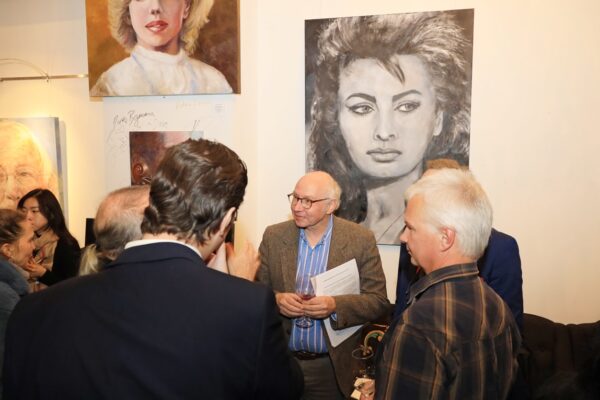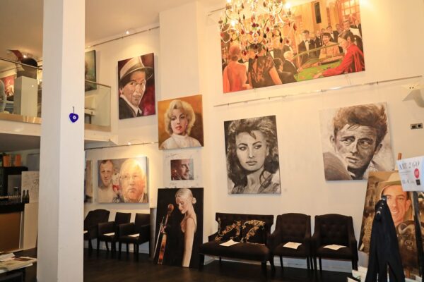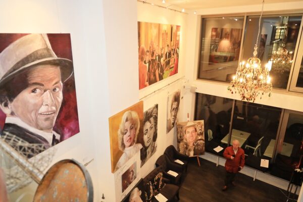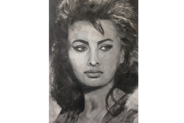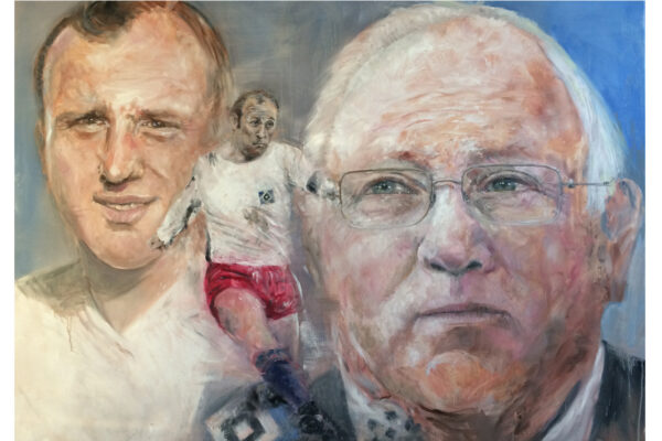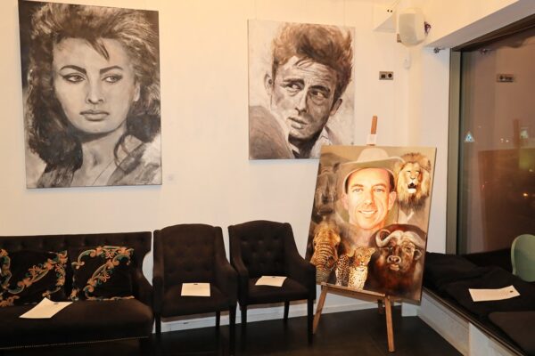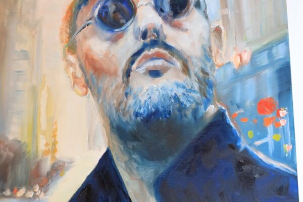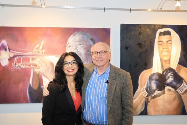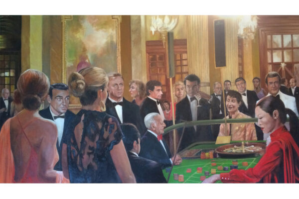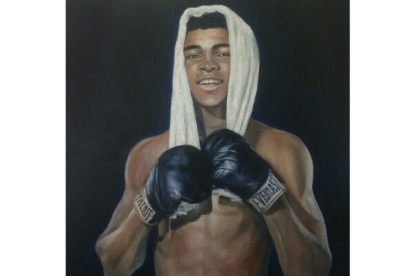 6 James-Bond-Darsteller sind porträtiert, natürlich um einen Spieltisch herum. Von links nach rechts Sean Connery, Daniel Craig, Timothy Dalton, Pierce Brosnan, George Lazenby und Roger Moore. Wer ist denn nun der Lieblingsdarsteller dieser Rolle für Holger? „Roger Moore. Mir gefiel seine überaus smarte und unaufgeregte Art, die Welt zu retten. Außerdem war er mir bekannt aus den beiden Serien „Simon Templar“ und „Die Zwei“, die ich schon als Kind im Vorabendprogramm verfolgte.“ Wenn Sie sich dieses Bild hinhängen, meine Damen und Herren, dann haben Sie immer etwas zu diskutieren, wenn Besuch kommt. Die unterschiedlichen athletischen Fähigkeiten, das Maß oder Übermaß an Raubeinigkeit, Eleganz oder mehr Muskeln sowie die Wirkung auf Frauen, die sogenannten Bond-Girls, sind doch wunderbare Themen. Betty meint, die Wirkung auf Frauen wäre bei allen gut gewesen. Ich muss sagen, dass mich Daniel Craig im letzten Bond in dieser Beziehung etwas enttäuscht hat. Ein vernünftiger Bond endet am Besten nach allen erlittenen Abenteuern mit einer Boudoir-Szene, wobei man natürlich genau weiß, dass das Glück nicht von Dauer ist, sondern höchstens bis zum nächsten Auftrag dauert, bei dessen Ausführung dann die nächste Schönheit aufgerissen wird. Nach meiner Erinnerung endete der letzte Bond damit, dass Daniel Craig mit seiner Filmpartnerin mit einem schnöden Oldtimer ins Glück fuhr. Wollen mal sehen, was aus den Beiden geworden ist. Der 25. Bond mit dem Titel „Keine Zeit zu sterben“ ist in Arbeit und Daniel Craig spielt wieder die Hauptrolle. Vorher gab es ja schon Gerüchte, dass – oh Schreck – eine Frau den Bond spielen könnte. Wie in der Schauspielerei spielt auch in der Malerei Begabung eine gewisse Rolle. Ich habe Holger folgende Frage gestellt: Wie wichtig ist Begabung in der Malerei und worin äußert sich diese Begabung (genialer Strich oder Beobachtungsgabe oder was sonst)? Seine Antwort fiel wie folgt aus: „Grundsätzlich glaube ich, dass jedes Kind begabt ist, wenn es aus reiner Freude heraus beginnt zu zeichnen und zu malen. Und wenn es nicht durch negative Erlebnisse gestoppt wird („Das soll ein Löwe sein. Für mich sieht das aus wie ein Pferd.“) und am Ball bleibt, kann es ein guter Maler werden. Ansonsten ist Malen sauberes Handwerk, das jeder Mensch lernen kann. Beobachtungsgabe kann man trainieren. Ich würde schätzen 25 % Begabung, 75 % Arbeit. Meine Meinung: nur wer das malerische Handwerk und deren Regeln beherrscht, ist dann auch in der Lage, die Regeln zu brechen und zu abstrahieren.“ Die personifizierte Begabung für ein Metier haben wir hier auch in der Ausstellung. Ich beziehe mich hier auf das Porträt von Muhammad Ali, bzw. damals hieß er noch Cassius Clay.