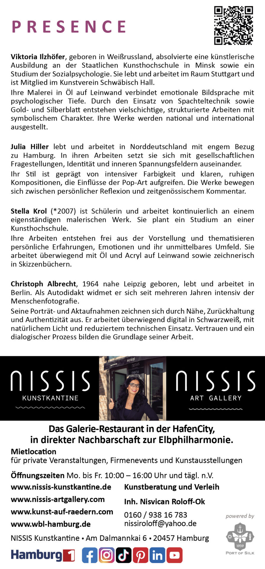 Julia Hiller ist eine aufstrebende Künstlerin, die in ihren Werken universelle Themen wie das Bedürfnis nach Gerechtigkeit, die Dynamik von Gesellschaft und Selbst und die ständige Auseinandersetzung mit ihrem Inneren erforscht. Sie lebt und arbeitet in Norddeutschland, stets mit Hamburg im Fokus – eine Stadt, mit der sie familiär seit Generationen verbunden ist.