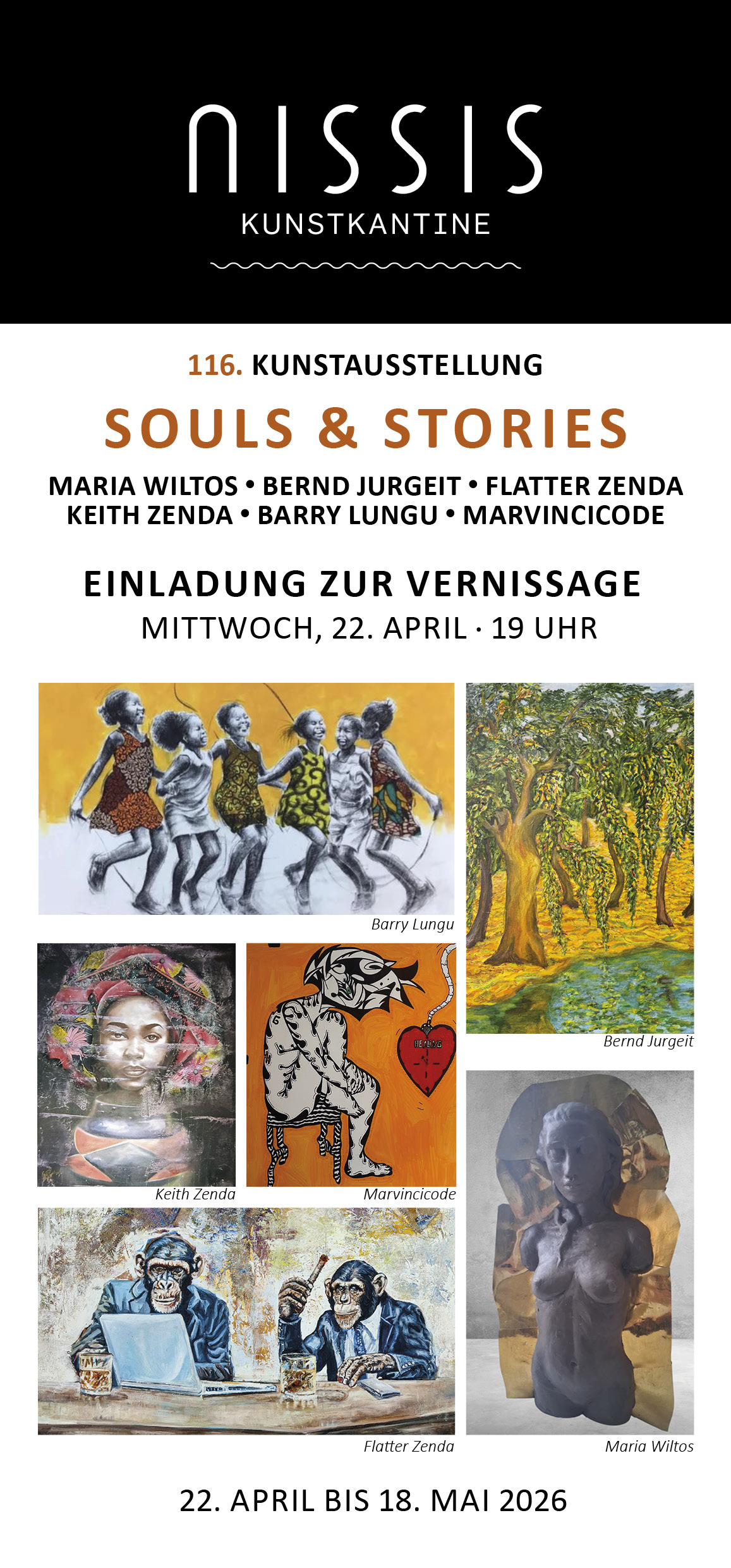 Einladung zur Vernissage am Mittwoch, den 22. April 2026 um 19 Uhr. Gemeinschaftsausstellung mit Maria Wiltos, Bernd Jurgeit, Flatter Zenda, Keith Zenda, Barry Lungu und Marvincicode.