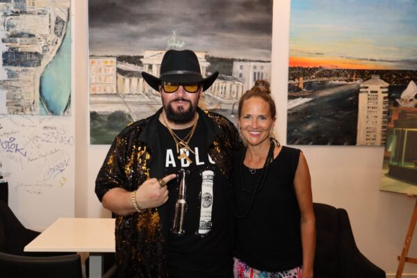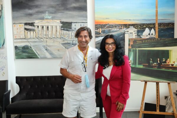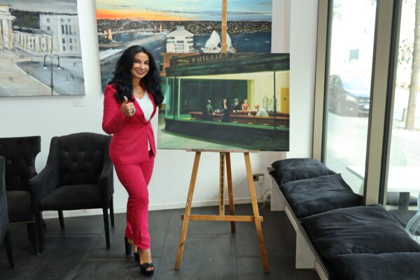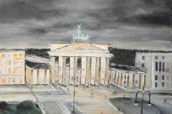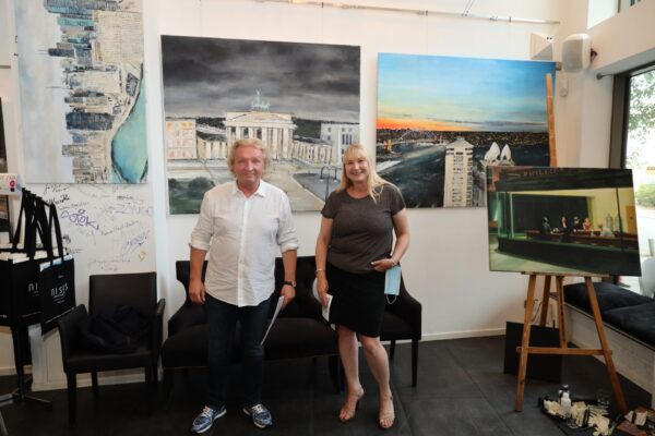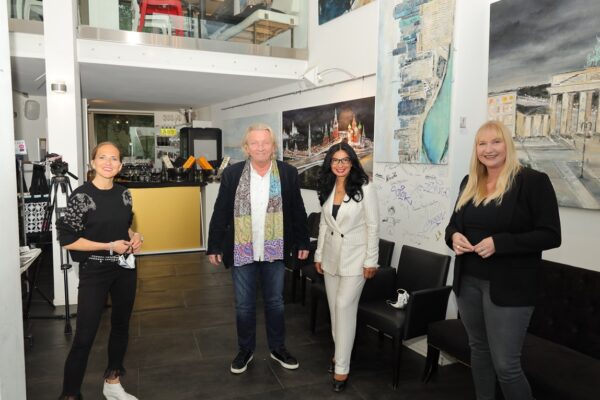 Laudatio Jeannine Platz     Liebe Freundinnen und Freunde der Kunstkantine, liebe Gäste, willkommen im   Bernsteinzimmer der HafenCity!   Mein Name ist Bernd Roloff, ich bin der Keynote-Speaker der Kunstkantine und darf Euch heute auf das Herzlichste begrüßen, zur 62. Vernissage von Nissis Kunstkantine seit ihrer Eröffnung im März 2013. Diese Vernissage gilt den Werken von Jeannine Platz. Die Ausstellung hat den Titel   Suite View   und sie hat ausschließlich Stadtansichten zum Gegenstand. Es sind Stadtansichten, die Jeannine Platz aus Hotelsuiten heraus gemalt hat. Suite Views eben. Sie hat aus den Fenstern von Hotelsuiten herausgeschaut und das Panorama auf die Leinwand gebannt.   Zum ersten Mal haben wir hier Stadtansichten in einer Ausstellung, die nicht Hamburg zum Motiv haben. In dieser Zeit der Reisebeschränkungen, denkt man, oh, da war doch was, man konnte mit dem Flugzeug in ferne Länder und Metropolen fliegen und es sich in Hotelsuiten gut gehen lassen.   Meine Damen und Herren, es ist die 2. Online-Vernissage der Kunstkantine im Live-Stream. Richtig Vernissage machen, das geht noch nicht. Wollen wir mal hoffen, dass sich das bald ändert. Die Einschränkungen gehen uns langsam auf den Geist und auf die Brieftasche sowieso. Keiner kann wirklich eine neue Normalität wollen. Wir wollen die alte Normalität zurück. Die Kunstkantine gehört rappelvoll, mit Blitzlichtgewitter, angeschickertem Publikum und ordentlich Boohei. Nur weil ein paar Chinesen auf halbdurchgebratenen Fledermäusen rumkauten und sich dabei eine Seuche zugezogen haben, laufen wir doch nicht den Rest unserer Tage mit einer Maske rum. Masken sind was für Chinesen, die sind immer schon damit rumgelaufen.   Zu meiner Rechten, meine Assistentin Betty. Betty wird meinen ausschweifenden und assoziationsreichen Vortrag im Analogmodus durch das Hochhalten von Exponaten unterstützen. Niemand braucht einen Beamer, wenn er Betty hat!   Betty und ich sitzen uns jeden Tag im Office gegenüber und bisher haben wir uns auch jeden Tag mit was infiziert. Ja, ihr habt richtig gehört, wir haben uns jeden Tag mit was angesteckt.   Und zwar haben wir uns mit Lachen angesteckt.   Mit Lachen kann man sich nur anstecken, wenn man keine Maske aufhat. Das ist ja wohl klar. So Betty, nimm die Maske ab, wir spielen jetzt alte Normalität.   Wir wollen unseren Spaß haben.   Jeannines  Konzept, sich in Hotelsuiten einzumieten und dann das sich entfaltende Stadtpanorama zu malen, ist mir unglaublich sympathisch. Für Luxushotels hatte ich immer schon eine Schwäche. Beginnen wir mit dem Adlon in Berlin.     Für Ihr Projekt buchte Jeannine die Brandenburger-Tor-Suite. So sieht das in dieser Suite von innen aus:     Meine Damen und Herren, es bedarf wohl keiner weiteren Darlegung, dass sich jeder Mensch von Geist und Lebensart in so einer Umgebung wohlfühlen muss. Nur absolute Frugalisten oder Camping-Fanatiker würden sich hier nicht wohlfühlen können.   Also Frugalisten; jetzt die Annotation: Das sind Menschen, die schon mit 29 in Rente gehen wollen, und vorher fanatische Sparer sind, konsumfeindlich, mit nur einer Glühbirne in der Wohnung, hoher Singlequote und natürlich belehren sie ständig alle Nichtfrugalisten.   Wie sieht so ein Frugalist aus? Typisches Beispiel: ein Kinnbartträger auf einem Damenfahrrad, dass ihm geschenkt wurde!   Diesem Herrn werden Sie im Adlon nicht begegnen! Ich schwöre es Ihnen! Wie wunderbar! Aber wir sind jetzt ja schon in die Brandenburger-Tor-Suite vorgedrungen, haben uns erstmal eine Zündkerze aus der Minibar gegönnt und mit einem reichlichen Schluck Jahrgangschampagner nachgespült.   Und was für ein Gemälde entsteht dort, wenn man das Motiv malt, das man aus dem Fenster sieht?   Richtig, es ist das Brandenburger Tor mit dem Pariser Platz davor.     Zweifellos ein sehr geschichtsträchtiger Ausblick über den es viel zu sagen gibt, aber fragen wir uns zunächst mal, wie Jeannine ein solches Gemälde zur Entstehung bringt, allein das ist schon eine höchst ungewöhnliche Machart. Sie schreibt mir Folgendes:   „Ich male ohne Pinsel, mit den Händen, weil ich so die Farbe und die Leinwand fühlen kann. Den linken Handrücken benutze ich als Farbpallette und mit den rechten Fingern mische ich die Farben auf meiner Handpallette an und male los. Für Akzente benutze ich einen Spachtel und für den Schlussakkord eine Zahnbürste. Damit setze ich Leuchtpunkte, die das Bild lebendig machen.“   Sehr interessant!   Haptik von Farbe und Leinwand mit den Fingern spüren wollen. Die linke Hand als Palette, da werden die Farben angemischt. Wer so malt, der ist auch dem von Künstlern oft beschriebenen Flow verfallen. Jeannine schreibt mir dazu:   „Das wichtigste an einem Bild ist für mich die Entstehung. Wenn ich in meinem Malprozess bin, in diesem unbeschreiblichen Flow, dann fühlt sich alles richtig an. Ich bin verbunden mit mir und dem Universum. Dann stimmt die ganze Welt. Am Ende kommt dabei ein Bild heraus. Ich bin selber überrascht, denn beim Malen ist das Denken ausgeschaltet und es ist alles Gefühl. Ich weiß vorher nie, wie das Ergebnis aussehen wird. Ich male einfach drauflos.“   Und dann kommt die Zahnbürste zum Einsatz.   Vergisst man daheim seine Zahnbürste, kommt in einem Haus wie dem Adlon selbstverständlich sofort ein dienstbarer Geist und bringt eine. Und wenn man mit Zahnbürsten malt, dann bringt einem das Adlon sicherlich eine Handvoll.   Ich konnte mich mehrfach von dem exzellenten Service des Adlon überzeugen und natürlich ist das tollste Beispiel von exzellenten Service wieder eine Anekdote, für die ich etwas weiter ausholen muss.   Die normalen Zimmer haben einen kleinen vom Badezimmer abgetrennten Raum, wo die Toilette angebracht ist. Klodeckel und Klobrille sind aus Mahagoni. So eine Mahagoniklobrille ist ein echter Schmeichler für den verlängerten Rücken. Holz ist ein Naturprodukt. Man kuschelt sich drauf und fühl