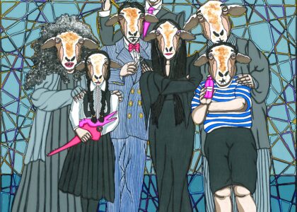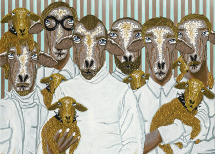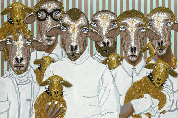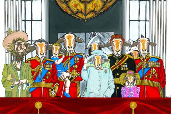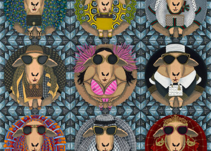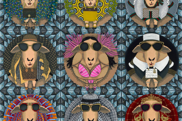 Schafe mit Vögeln, Schafherren mit Kummerbund, Schafe mit Martini oder Schokolade, Wasserschafe, Schafe mit Pfauenfedern oder Bubblegum, Mondschafe, Schafe mit floralem Hintergrund, auch mit Käfern. Und jede Menge Promi-Schafe.