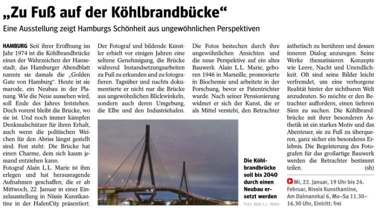 Artikel im Hamburger Wochenblatt zur Ausstellung ZU FUSS AUF DER KÖHLBRANDBRÜCKE Alain Marie (22.01.-24.02.2025)