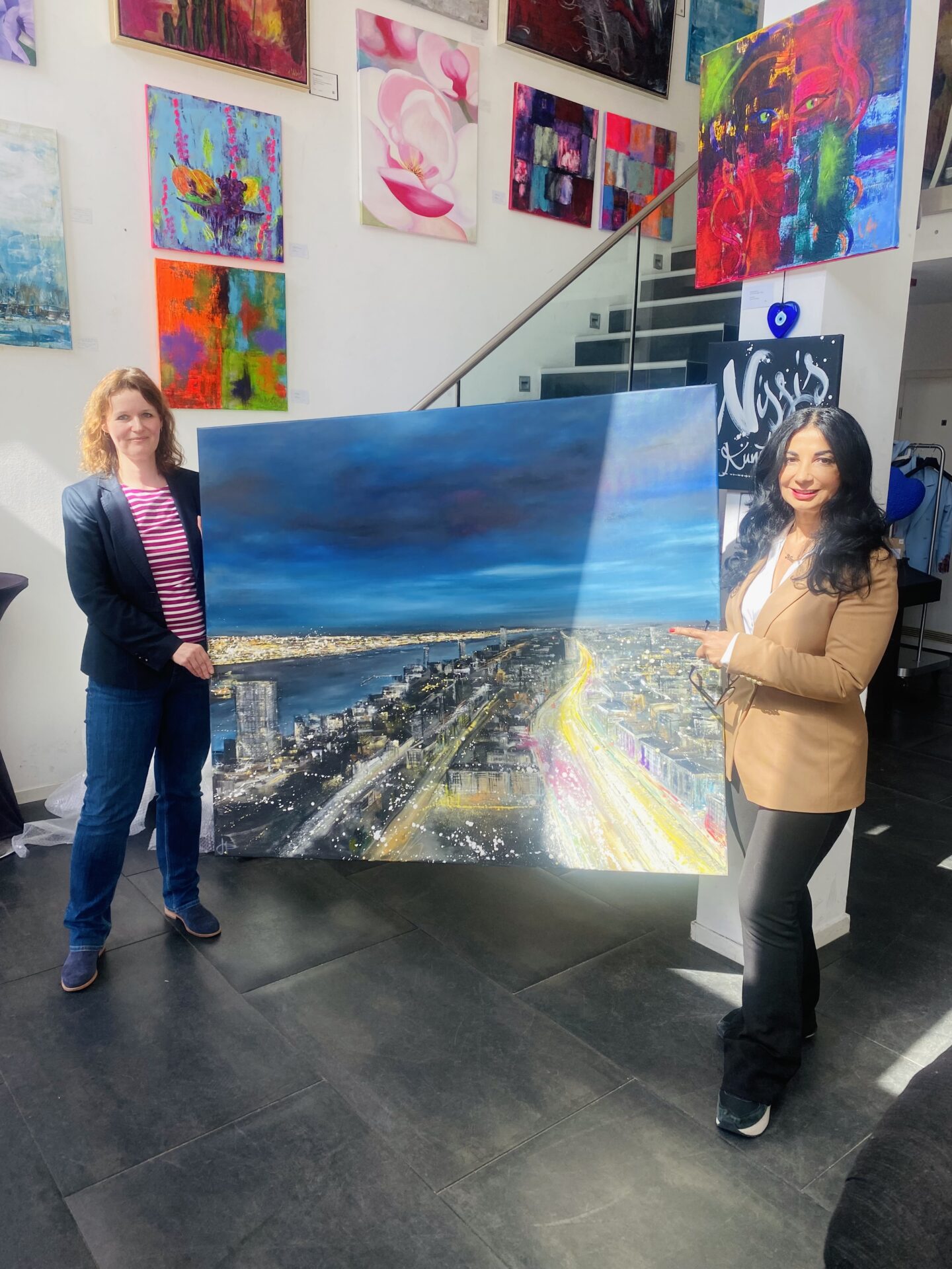 Im Auftrag vom Kinderhospiz Sternenbrücke steht ab sofort das wunderschöne großformatige Werk Clouds Tanzende Türme (120 x 140 cm, Öl auf Leinwand, 2017) unserer Galeriekünstlerin Jeannine Platz zum Verkauf. Es zeigt die Aussicht von der Rooftopbar Clouds in den Tanzenden Türmen bei Nacht: die Elbe, den Hamburger Hafen und die Reeperbahn.