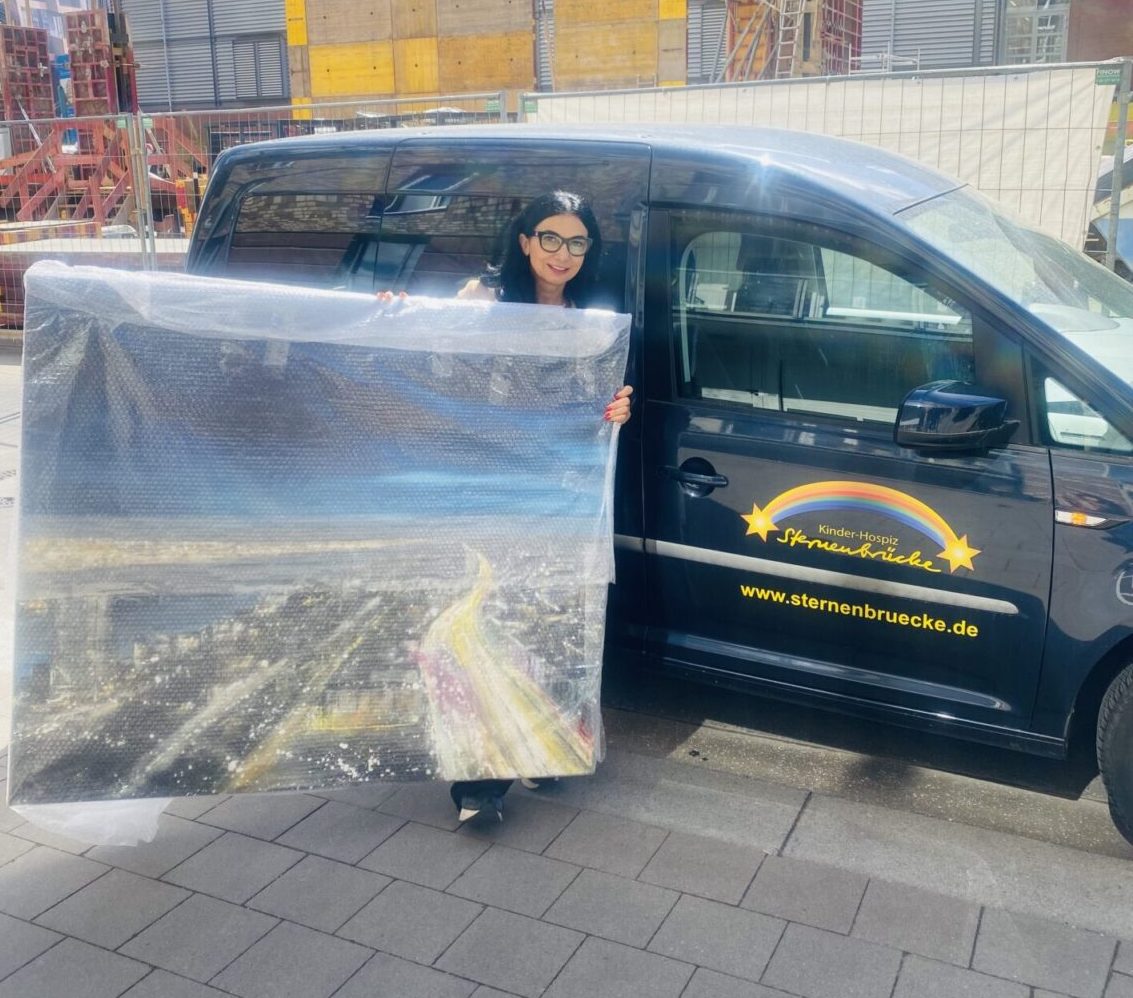 Stille Versteigerung des Gemäldes „Clouds – Tanzende Türme“ von Jeannine Platz sowie Verkauf von künstlerisch gestalteten Stofftaschen durch die Künstlerin zugunsten des Kinderhospiz Sternenbrücke