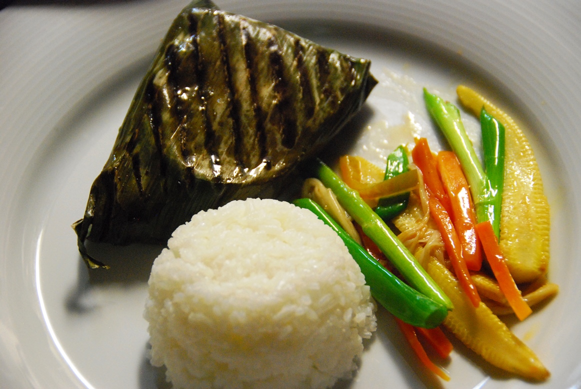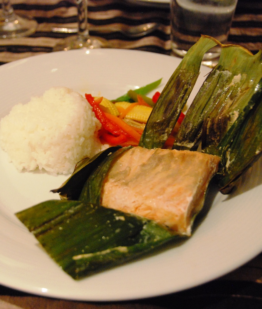 mit Frischkäse-Gurken-Crostini - Lachsfilet im Bananenblatt gegrillt